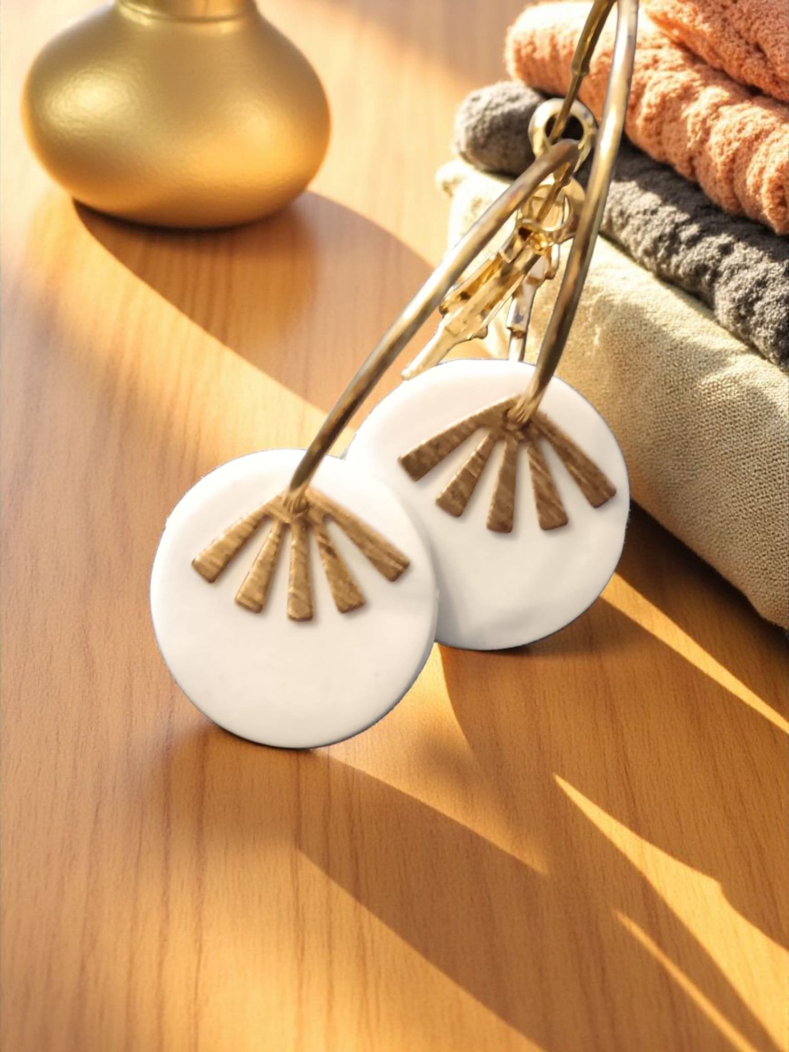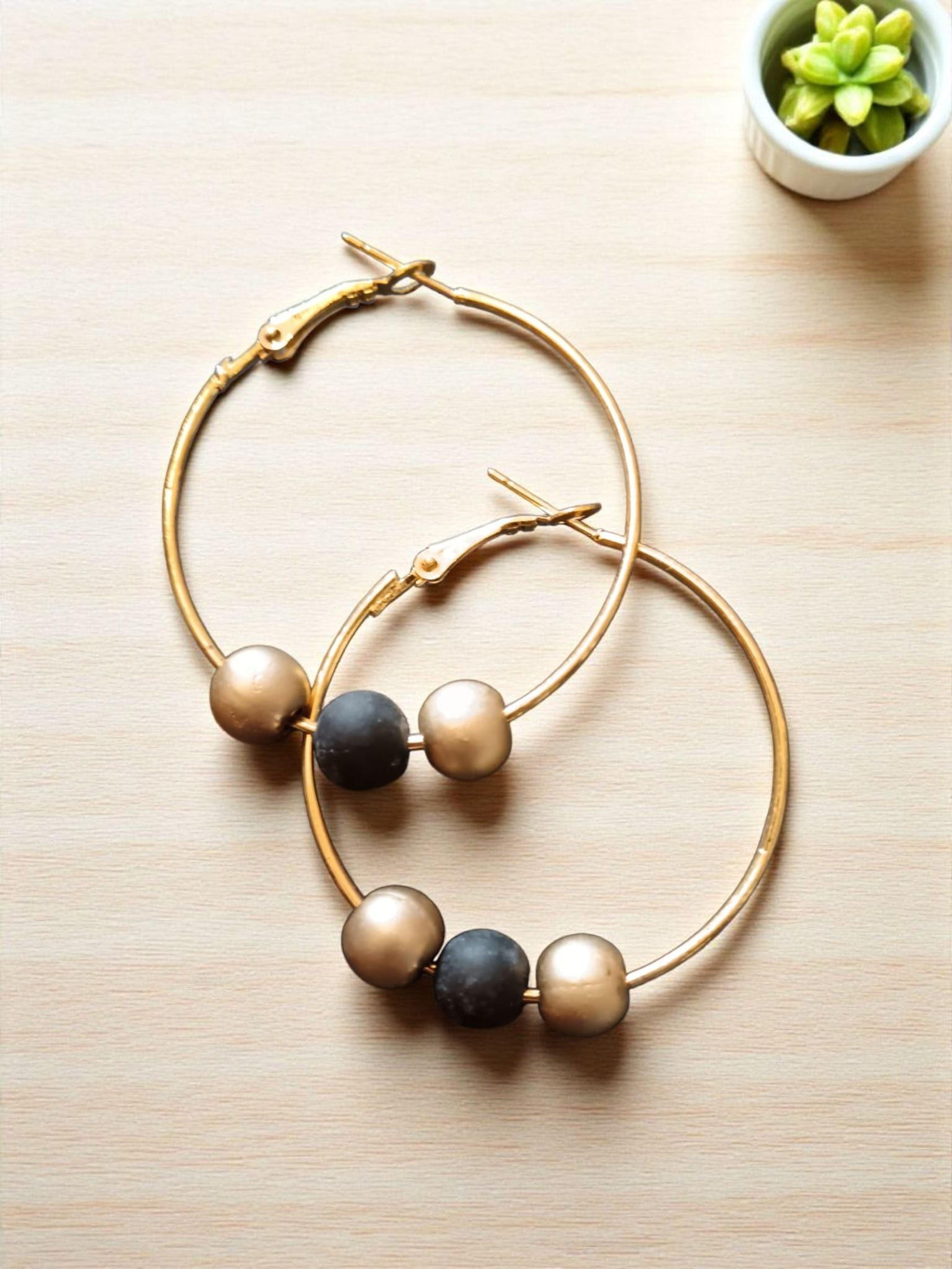 Son pendientes construidos en el acero inox bañados en color oro y con adornos en arcilla polimérica como todos nuestros pendientes son hipoalergénicos hay de aro grande, aro mediano y aro pequeño