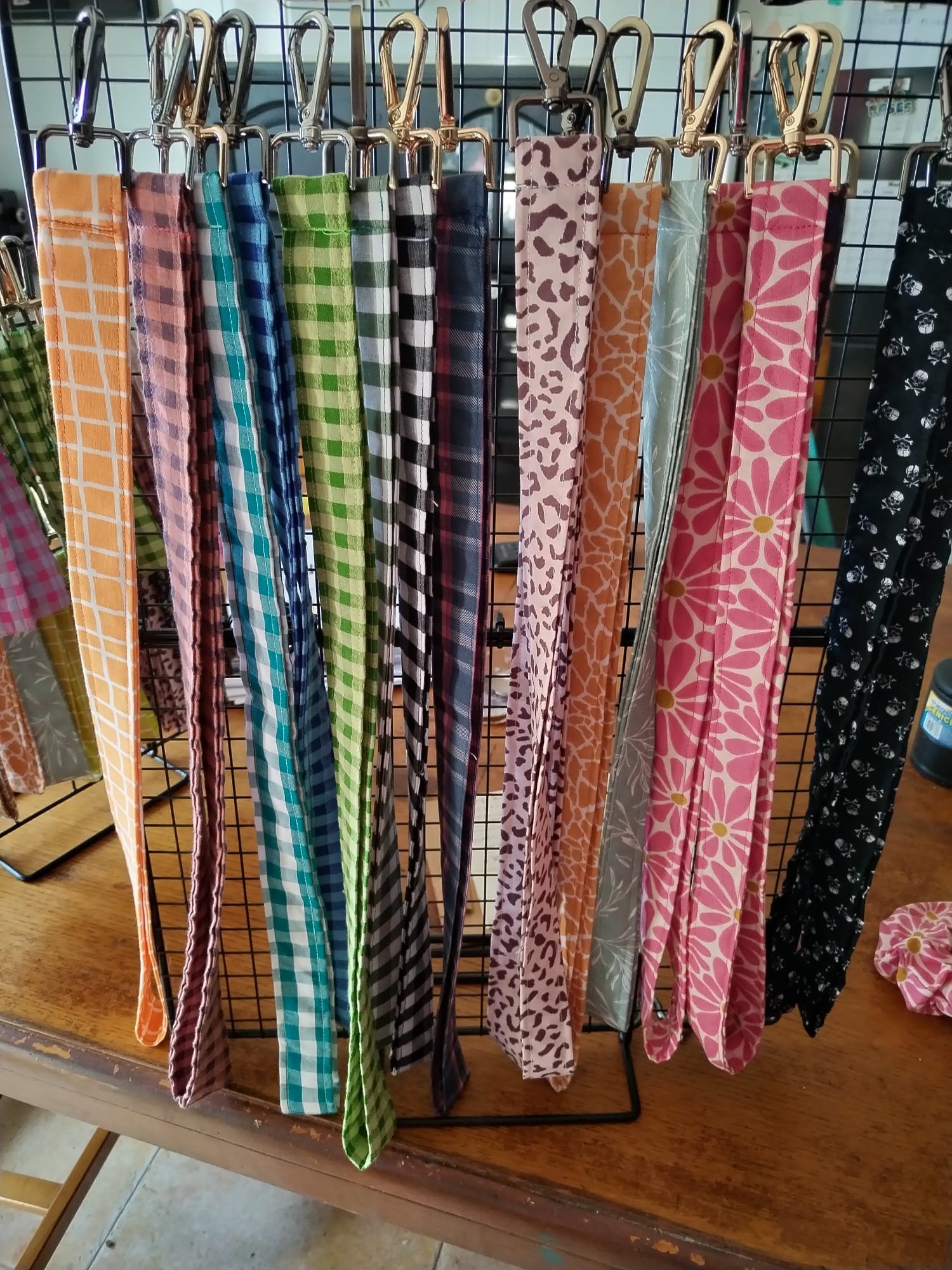 Son llaveros de tela con cierres de calidad en color oro plata bronces y cromados Y fabricados con tejidos de algodón en bichi florales animal print etc tienen una medida aprox de entre 45 y 50 cm de longitud y son ideales para llevar colgados llaves móvil tarjetas indentificarivas de fichaje etc precio 10 e iva incl